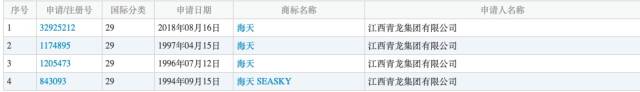 另外,就第30类商标(调味料)方面,海天味业“海天”注册信息为72条,青龙集团则是为0。