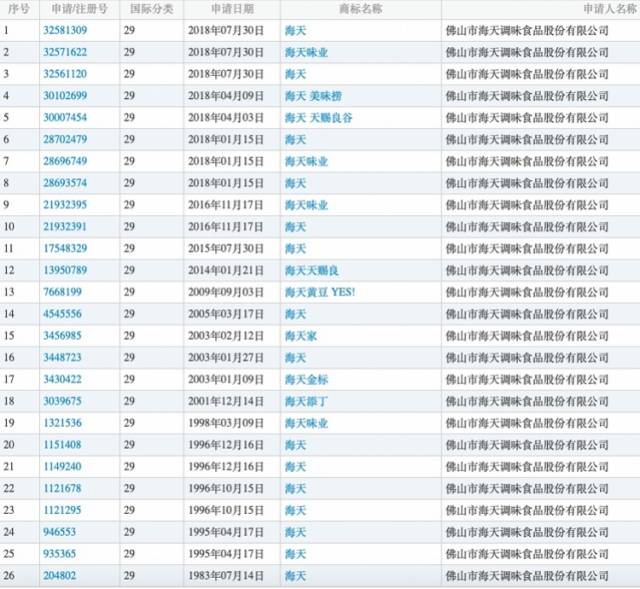 江西润心“海天”商标范围均为食用油,海天味业今年也在申请