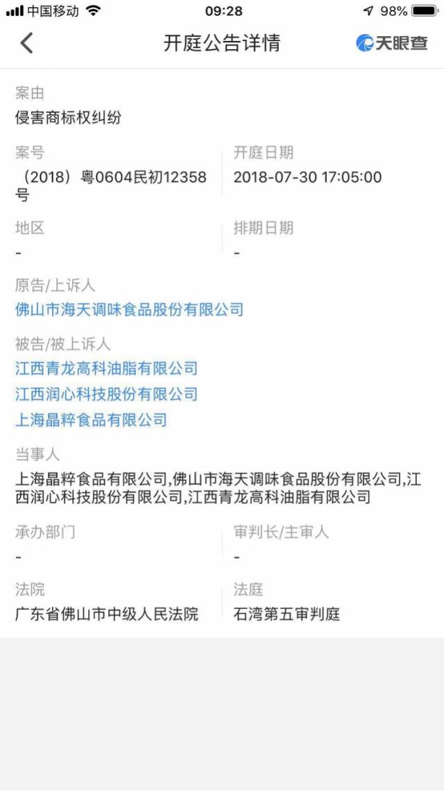 另外,南都记者通过“天眼查”了解到, 海天味业就以侵害商标权为由,将江西润心,及其控股公司江西青龙高科油脂有限公司及上海晶粹食品有限公司告上法庭,该案于今年7月30日在广东省佛山市中级人民法院开庭审理,一审结果尚未公布。